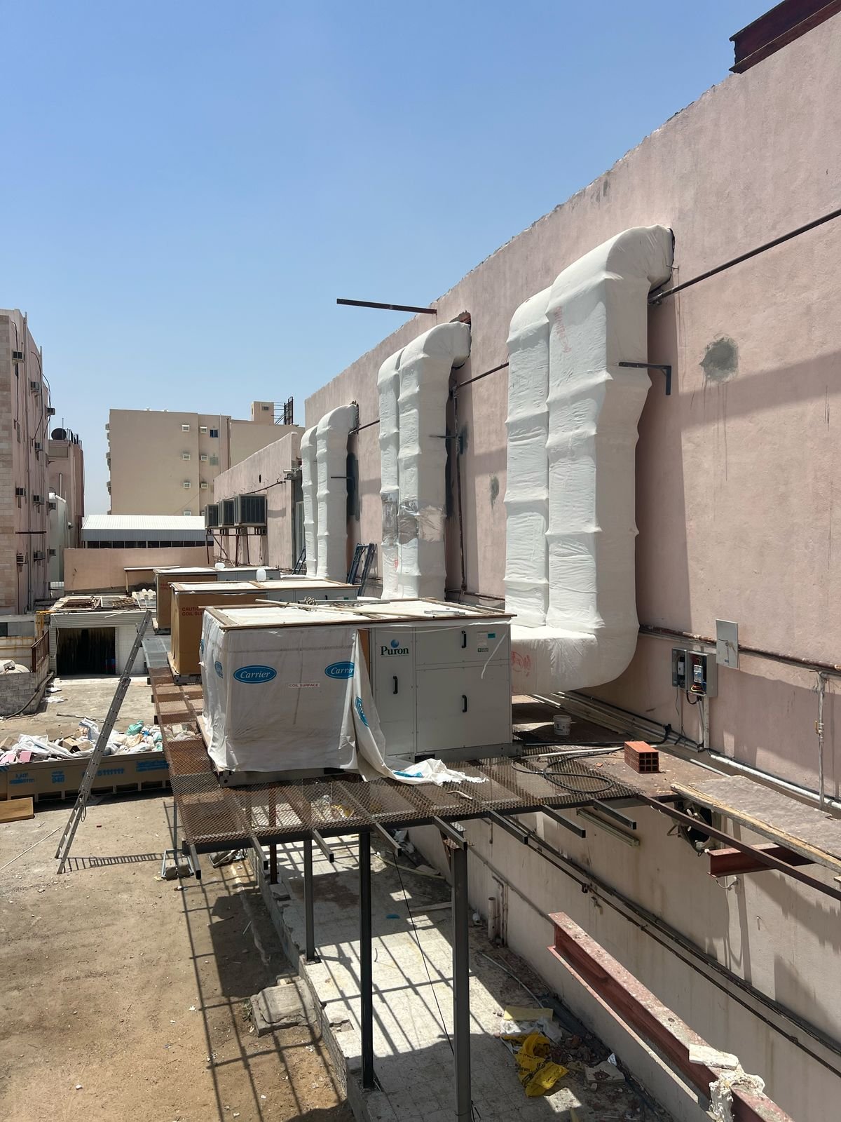 2- يتم تثبيت كافة المجاري الهوائية والمكان وخلافه بواسطة زوايا حديد وتعلق بالسقف الخرسانية بقلاب مسنن معلقة وتشد الأسقف بمسامير عالية الجودة مدهونة بطبقة أساس ضد الصدأ وأسباخ مسنن.